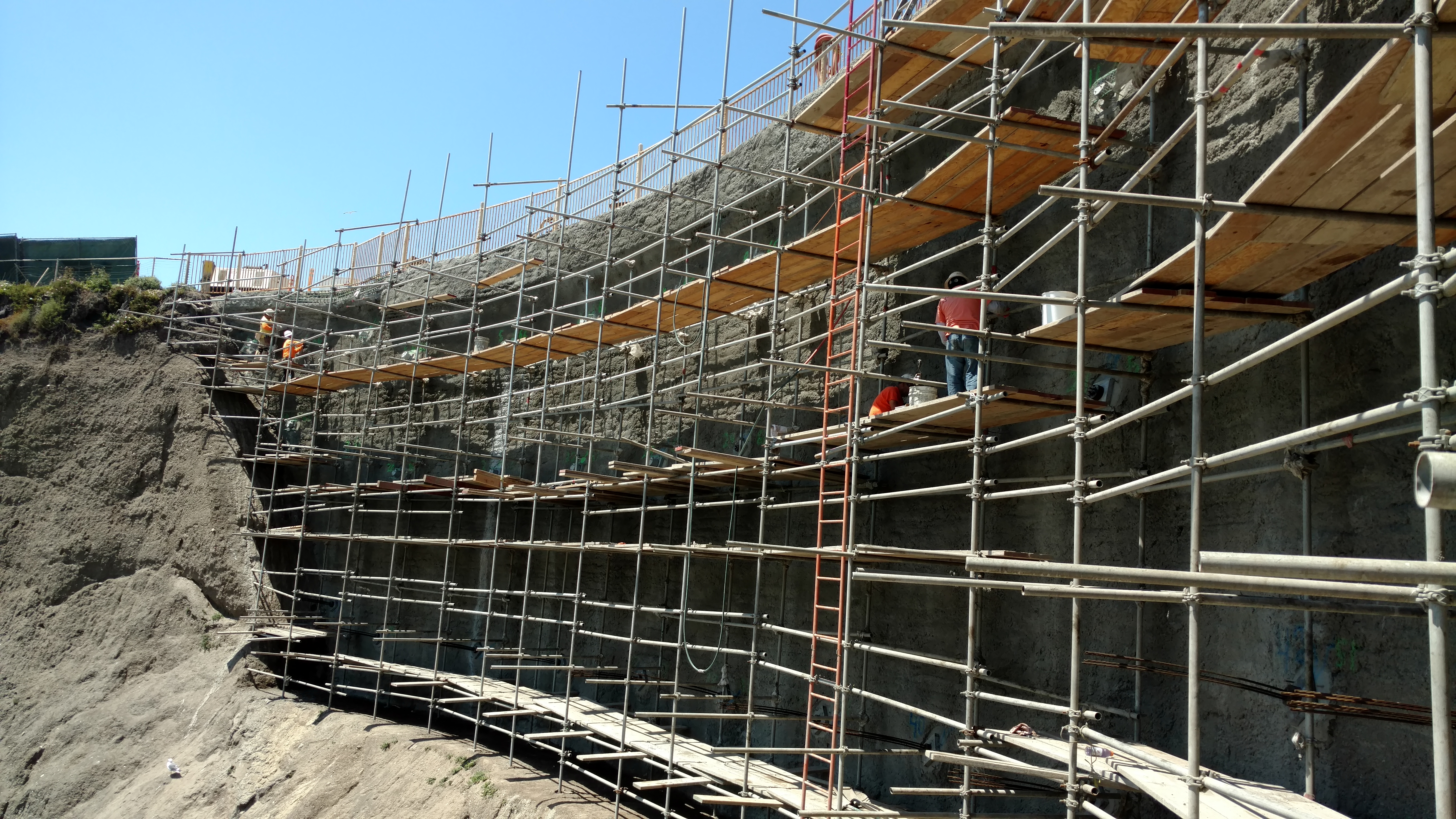 Earth Systems is working on three seawalls being constructed at the Shore Cliff Lodge. The original caissons were installed in 1979. The walls now consist of two rebar curtains covered with shotcrete, tie-backs drilled into the bluff and tensioned. The entire wall is then covered with another layer of shotcrete. The outer layer is colored and sculptured to blend in with the existing bluff.